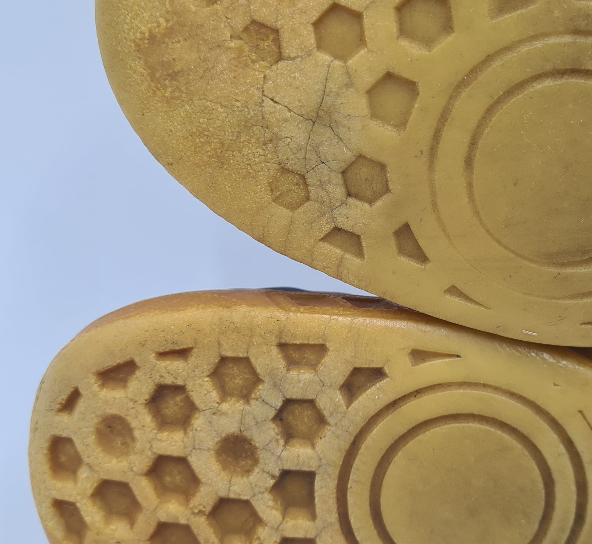 - Zustand: getragen mit Gebrauchsspuren, Sohlen vergilbt, sichtbar abgelaufen und etwas brüchig (Bild 3), Leder hinten im rechten Schuh leicht beschädigt (Bild 4), Schnürsenkel nicht original
